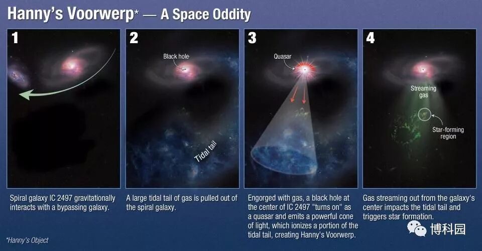 (图8)天文学家发现哈尼天体(Hanny's Voorwerp)是在星系周围30万光年的气体流中唯一可见部分。绿色Voorwerp是可见部分,因为来自星系核心的强烈光束照亮了它,该光束来自类星体,这是一个由黑洞驱动的明亮而充满活力一类物质。与另一个星系相遇给黑洞提供了能量,并从IC 2497中剥离了气体流。