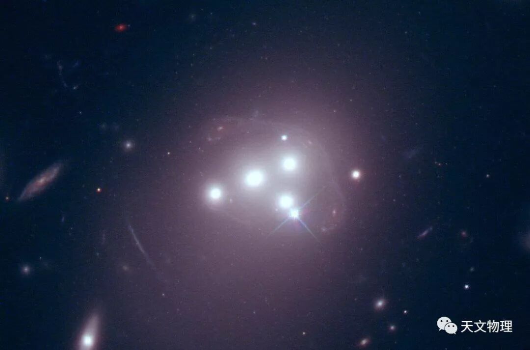 哈勃太空望远镜拍摄的4个巨型星系的中心在Abell 3827中心,近三个小时的曝光显示了人眼可见的波长,以及近红外线,这是2015年最初的研究中使用的。在星团后面的一个更遥远的星系被扭曲的图像被模糊地看到,围绕着四个星系。图片:NASA/ESA/Richard Massey (Durham University)