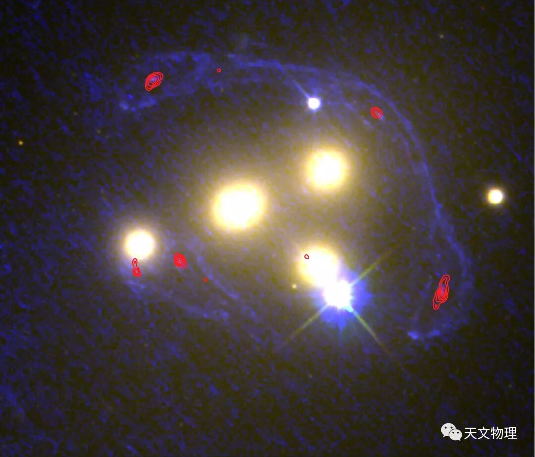 在Abell 3827星团中心的四个中心星系,在更广泛的波长范围内,包括哈勃太空望远镜成像在紫外线(显示为蓝色)和Atacama大毫米阵列成像在非常长的(亚毫米)波长(显示为红色等高线)。在这些波长处,前景集群变得几乎透明,使得背景星系更加清晰可见,现在更容易确定背景星系是如何被扭曲的。图片:NASA/ESA/ESO/Richard Massey (Durham University)