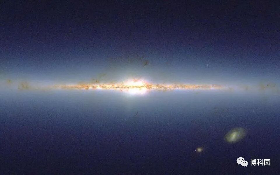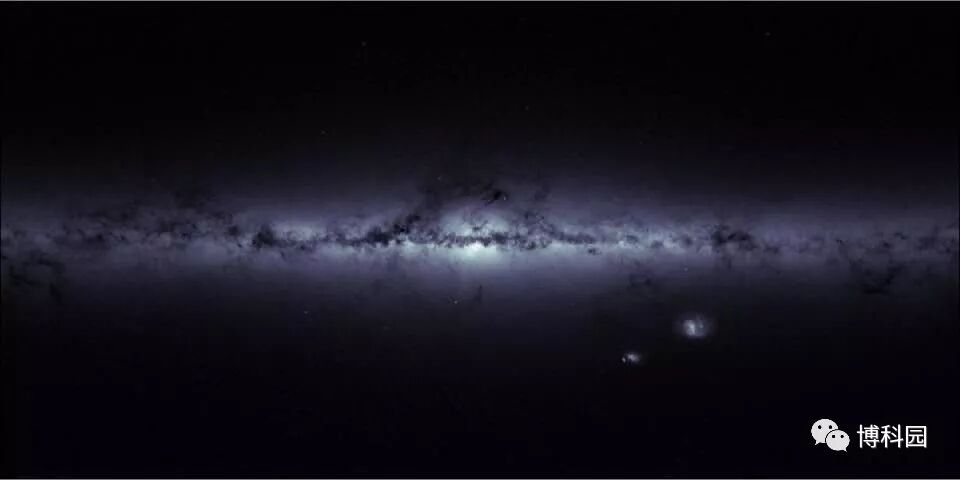 一幅银河系和周围天空的天体图清晰地显示出银河系的恒星密度和大小麦哲伦星系(我们星系中最大的两个星系)。如果你自仔细看,杜鹃座47位于小麦哲伦星系的左边,武仙座星团略高于星系核心,M15略低于星系核心。银河系的整个范围很难在银河系银道面内确定。