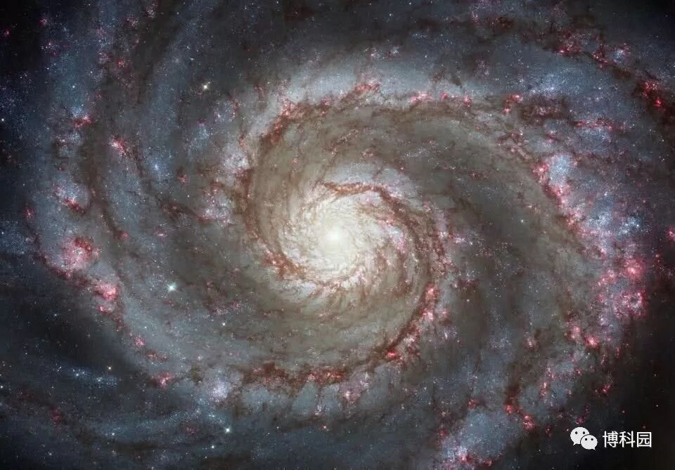 漩涡星系(M51)旋臂是粉红色的,因为有大量即将成型的恒星在旋臂上出现。在特殊情况下,邻近星系与漩涡星系引力作用促进了恒星的形成。所有富含气体螺旋都在某种程度上呈现出新星诞生的态势。