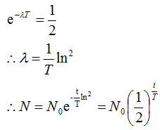 若半衰期为T,则当 t = T 时,N = N0 /2