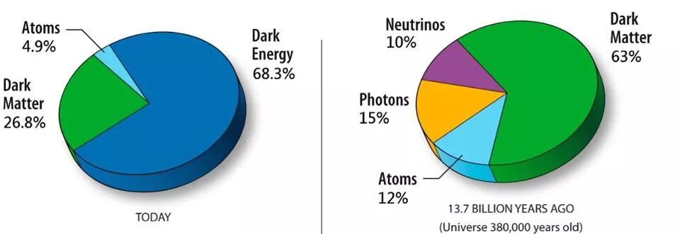 ○ 根据ΛCDM,今天的宇宙是由68.3%的暗能量、26.8%的暗物质和仅仅为4.9%的“普通”物质(包括恒星、星系、气体、尘埃、等离子体、黑洞等等)所构成(左边)。早期的宇宙则拥有不同的成分(右)。 | 图片来源:NASA