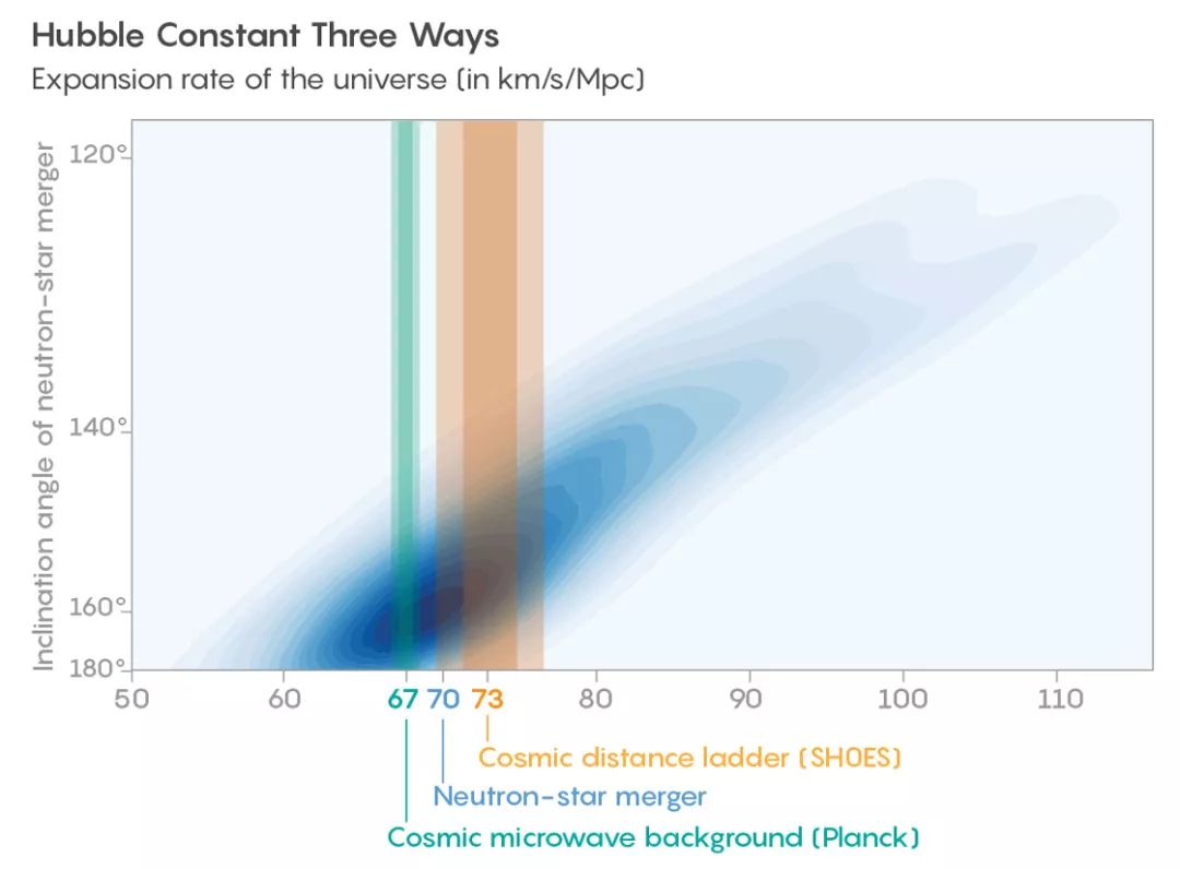 ○ 测量哈勃常数的三种方式:宇宙微波背景(普朗克)、双中子星合并(引力波)、宇宙距离阶梯(SH0ES)。双中子星合并所测量的值恰好介于其它两种方法之间,但由于这只是一次性事件,因此误差远大于另外两种。 | 图片来源:DOI:10.1038/nature24471