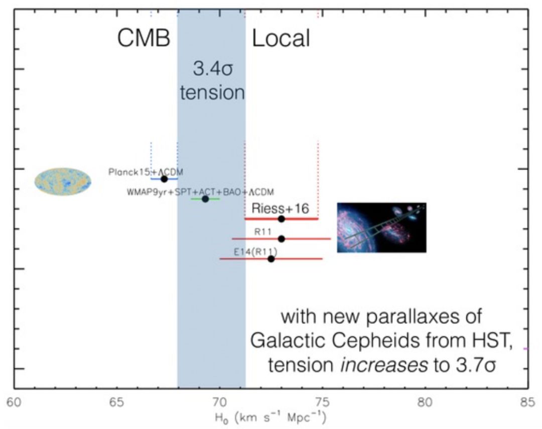 今年1月3日,Riess发表了对哈勃常数的最新测量结果为73.48 ± 1.66 km/s/Mpc,进一步确认了2016年的发现。