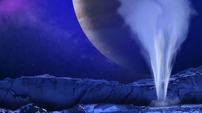 研究人员一直相信欧罗巴(Europa,木卫二)在它那红白花斑的冰壳之下有可能埋藏了一个液态海洋。而就在一项刚发表在《自然-天文》的论文中,科学家从伽利略号探测器的数据中找到了欧罗巴将液态水喷射到太空的证据[2]。
