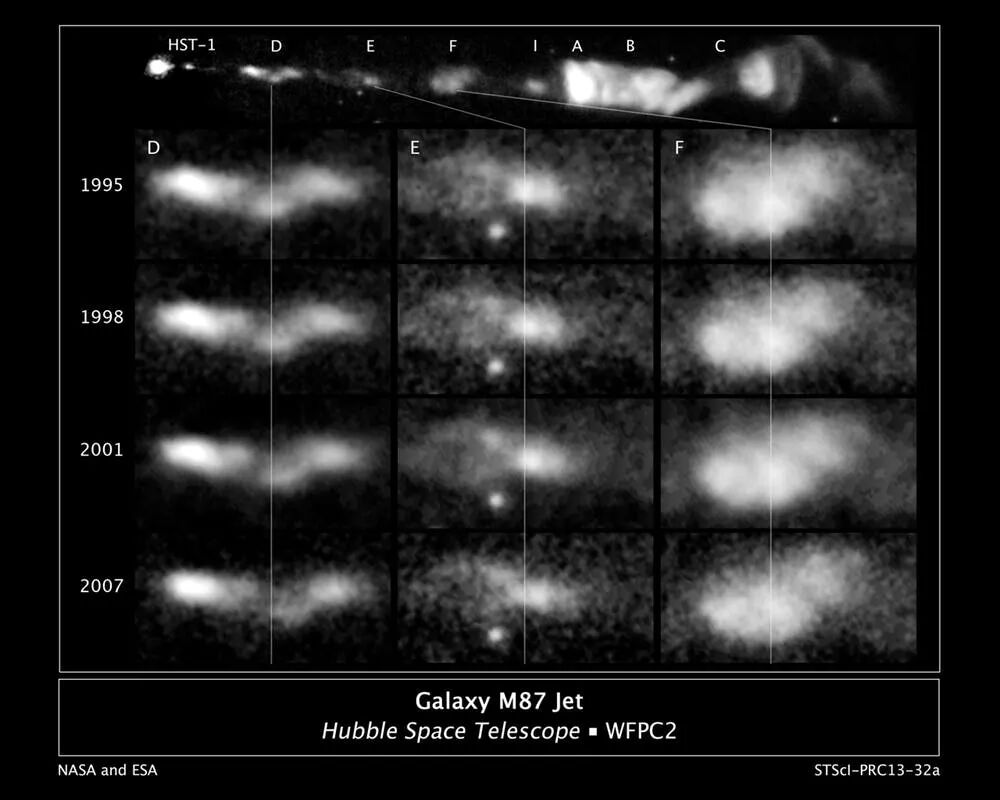 马里兰大学的物理学助理教授Eileen Meyer在她的研究中,利用哈勃档案的数据制作了与“喷流”有关的动态视频(喷流是从黑洞中喷射出的高速等离子束)。她用超过400张、时间跨度为13年的原始影像,将附近星系M87的喷流制作成视频。这一视频首次显示了等离子体的扭摆运动,表明了喷流具有螺旋结构。