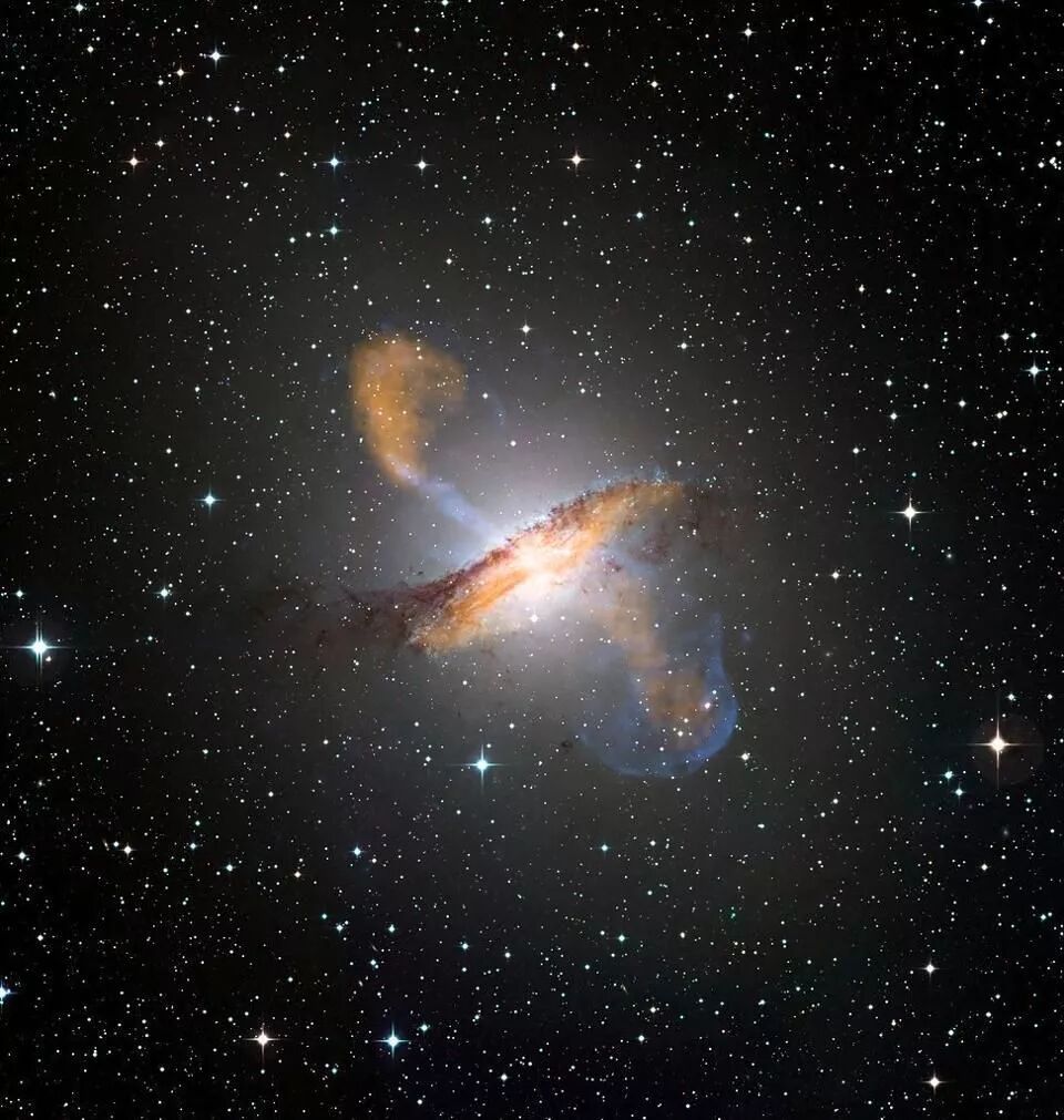 ○半人马座A星系(银河系周围最近的活跃星系)的综合视图。在这个星系周围观测到16个卫星星系,其中14个卫星星系看似乎在一个平面上共同旋转,与冷暗物质的模拟预期不同。| 图片来源: ESO/WFI; MPIfR/ESO/APEX; NASA/CXC/CfA/