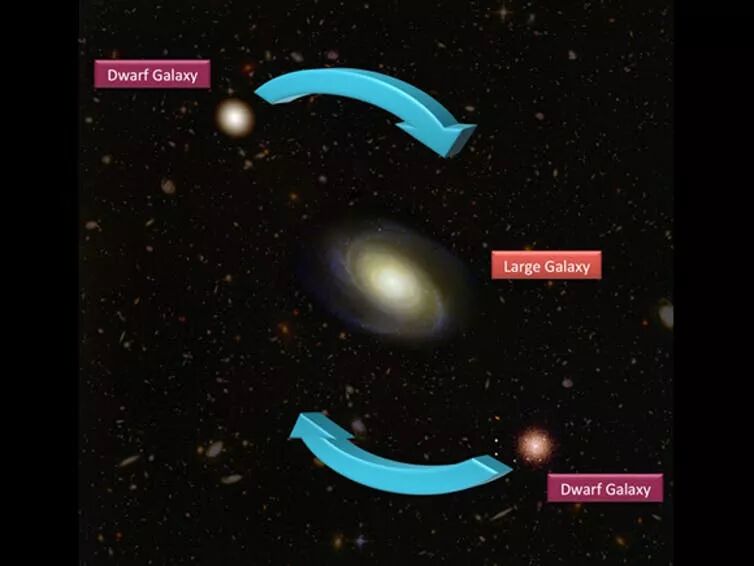 ○围绕着大型星系旋绕的矮星系轨道示意图。| 图片来源:Geraint Lewis and the Hubble Space Telescope Image Archive