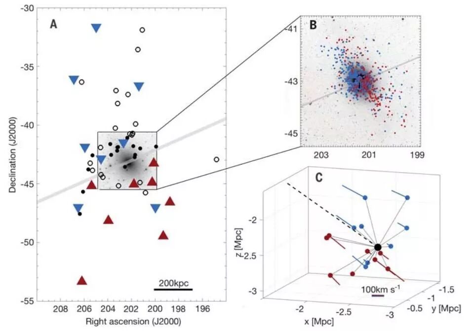 2月2日,一篇发表在《科学》杂志的新研究就指出,在邻近的椭圆星系半人马座A的周围环绕着一些“矮卫星星系”(较小的星系),它们在寄主星系周围的一个平面上进行同步旋转。这一发现与预期的结果并不相符。
