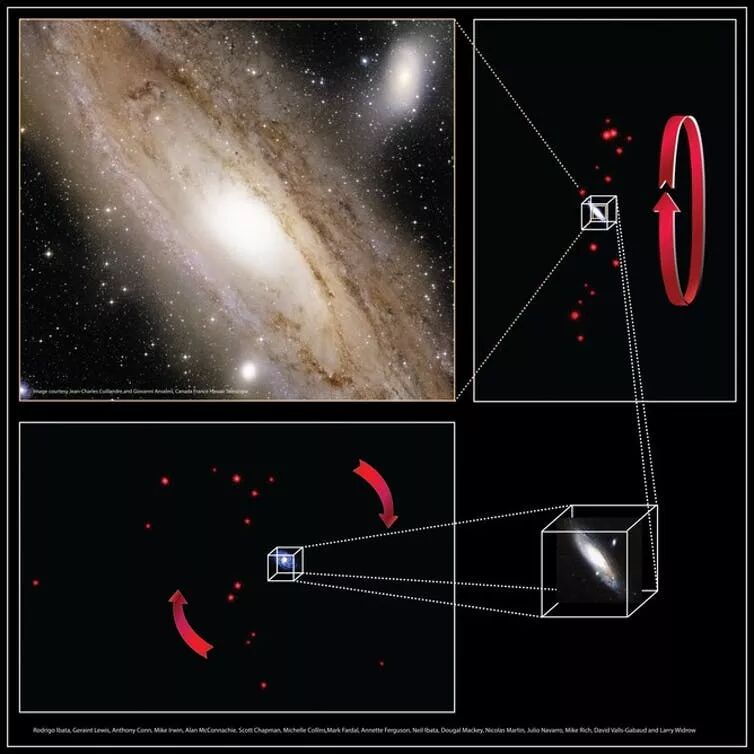 ○仙女座星系周围发现的矮星系轨道上泛起的整齐一致的“舞蹈”。| 图片来源:R. Ibata & Nature