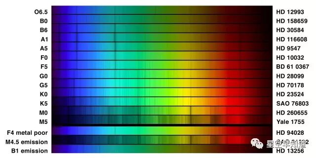 恒星光谱图,右侧是不同恒星的编号,左侧是不同的恒星光谱型,其背后往往反映了恒星的大小和温度差异