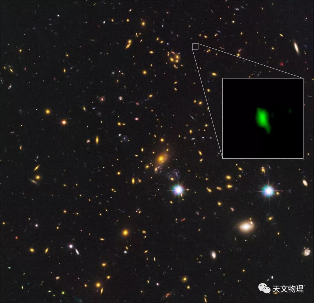 与美国宇航局/ESA哈伯太空望远镜和inset图像一起拍摄的银河星系团J1149.5+2223,是与阿尔玛观测到的132.8亿光年的星系MACS1149-JD1,在这里阿尔玛的氧气分布被描绘成绿色。图片:ALMA (ESO/NAOJ/NRAO), NASA/ESA Hubble