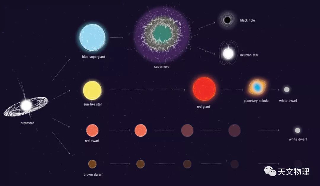这张图片显示了不同质量恒星的演化方向。在释放它们的外部气体之前,可以看到像太阳一样的恒星膨胀成红色的巨星,围绕一个被称为白矮星的坍缩的核心形成彩色的星云。图片:ESA