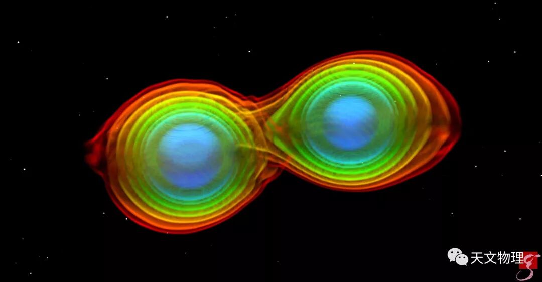 数值模拟描述了两个螺旋合并的中子星,高密度(中子星的内部)以蓝色表示,而较低的密度(中子星的外壳)以红色表示。图片:T .Dietrich/S. Ossokine/H. Pfeiffer/A. Buonanno/Max Planck Institute for Gravitational Physics/BAM collaboration