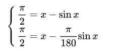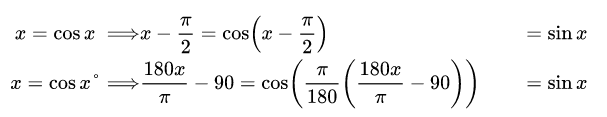 In [] = FindRoot[x==Cos@x,{x,0}]        x-Pi/2/.FindRoot[Pi/2==x-Sin@x,{x,1}]        FindRoot[x==Cos[Pi x/180],{x,0}]        180x/Pi-90/.FindRoot[Pi/2==x-Pi Sin@x/180,{x,1}]Out[] = 0.7390851332151605`         {x -> 0.7390851332151607`}         0.9998477415310987`         {x -> 0.9998477415310881`}