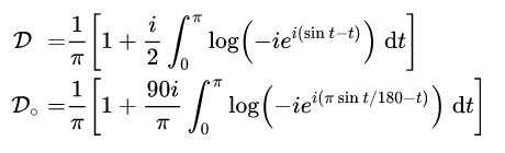 (*真男人从不回头看数值验证*)(2 + I Integrate[Log[-I/E^(I*(t - Sin[t]))], {t, 0, Pi}])/(2*Pi)//N(Pi + 90I Integrate[Log[(-I)*E^((-I)*t + (1/180)*I*Pi*Sin[t])], {t, 0, Pi}])/Pi^2//N> 0.7390851332151609` > 0.9998477415310951`
