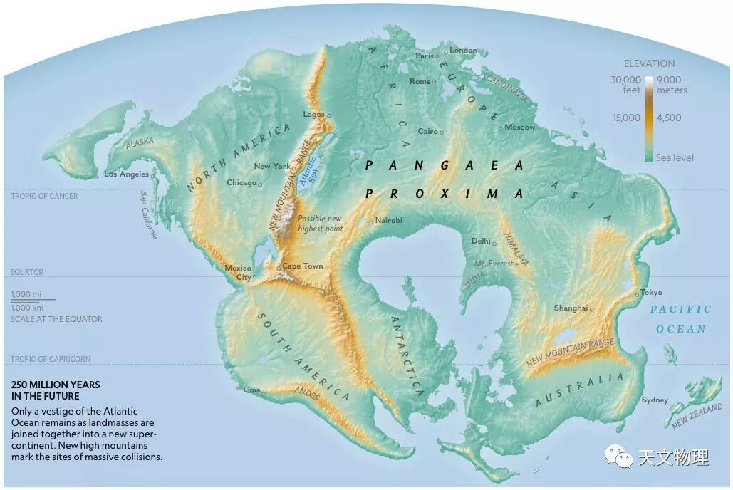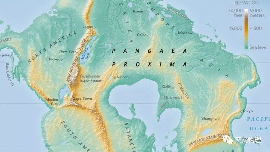 再过两亿五千万年将有下一个超级大陆,并且已经有了名字:Pangea Proxima(盘古大陆)。这就是到时地球将会是什么样子的:南北连接非洲的美洲和南方的南极洲,非洲撞上了欧洲和中东,澳大利亚与亚洲东部相连。这个巨大的大陆以印度洋的遗迹为中心,现在的内海与以前的地中海相映成趣。大陆相撞的地方出现了新山脉。世界新的高峰不再位于喜马拉雅山脉,而是在佛罗里达和格鲁吉亚抨击南非和纳米比亚的地区出现尚未命名的地区。