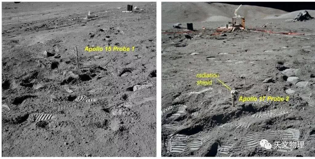左图:这张由宇航员詹姆斯·欧文拍摄的照片显示了从地面伸出的阿波罗15号热流探测器1的钻孔和电缆。在borestem周围,可以看到宇航员的脚印。右边:这张由宇航员哈里森·施密特拍摄的照片显示了从地面伸出的阿波罗17号探测仪的电缆。图片:NASA