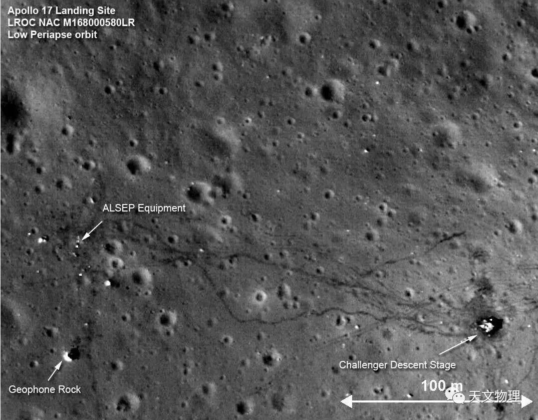 阿波罗17号着陆点附近的月球勘测轨道飞行器(LROC)图像。注意,月球表面实验部署点周围的表面比周围的环境要暗。图片:NASA
