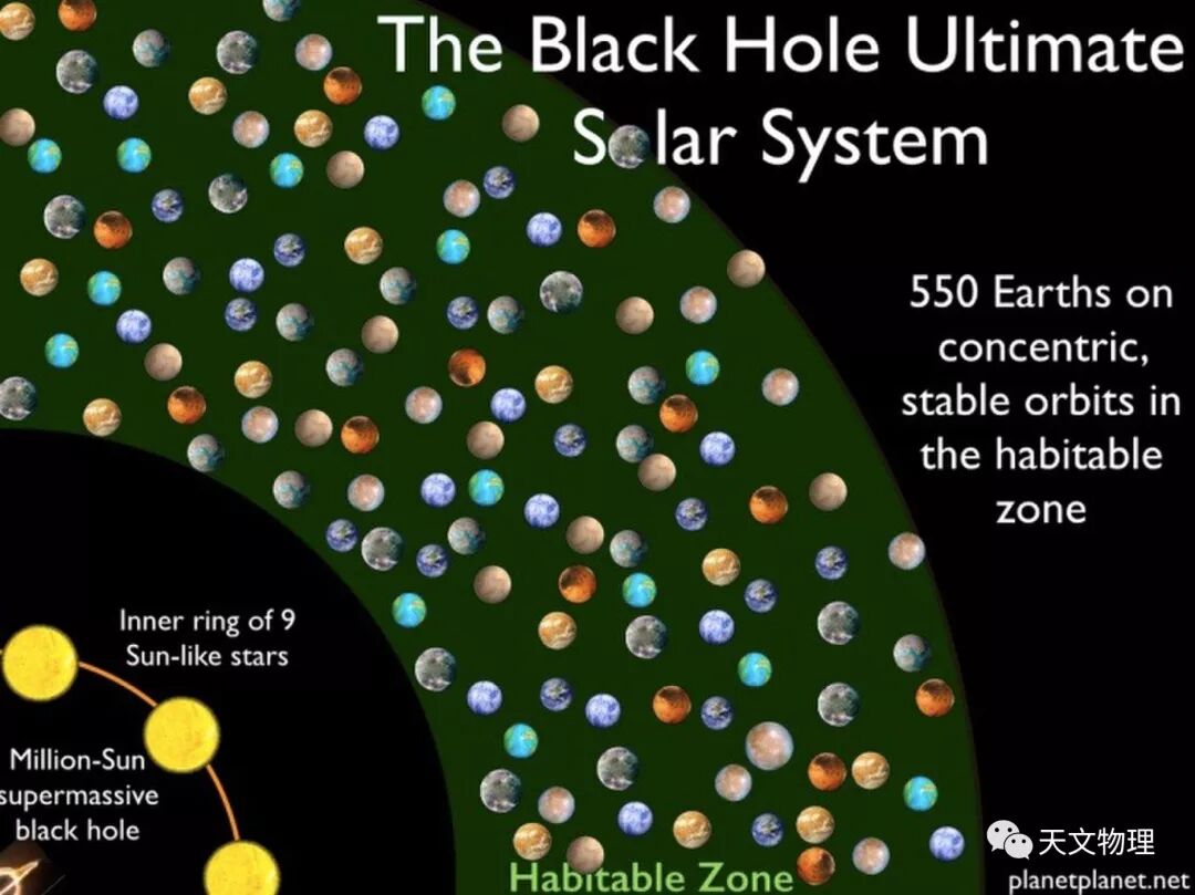 在这种情况下,行星再次需要1.6到4.6天才能完成一个轨道。雷蒙德并没有把九颗类日恒星放在黑洞和行星之间,而是建议人们可以把36颗类日恒星放在一个6天文单位宽的环中。在这种情况下,“每个行星都沐浴在来自四面八方的阳光中——行星没有夜晚的一面。这就像阿西莫夫永恒的白天星球卡加什。在这些星系中,永远不会感到孤独——其他星球将在天空中出现。邻近的行星距离地球的距离是月球的10倍,这意味着它们在天空中出现的距离是满月的40倍。这个尺寸和手提电脑的大小差不多,只在手臂够得着的地方。