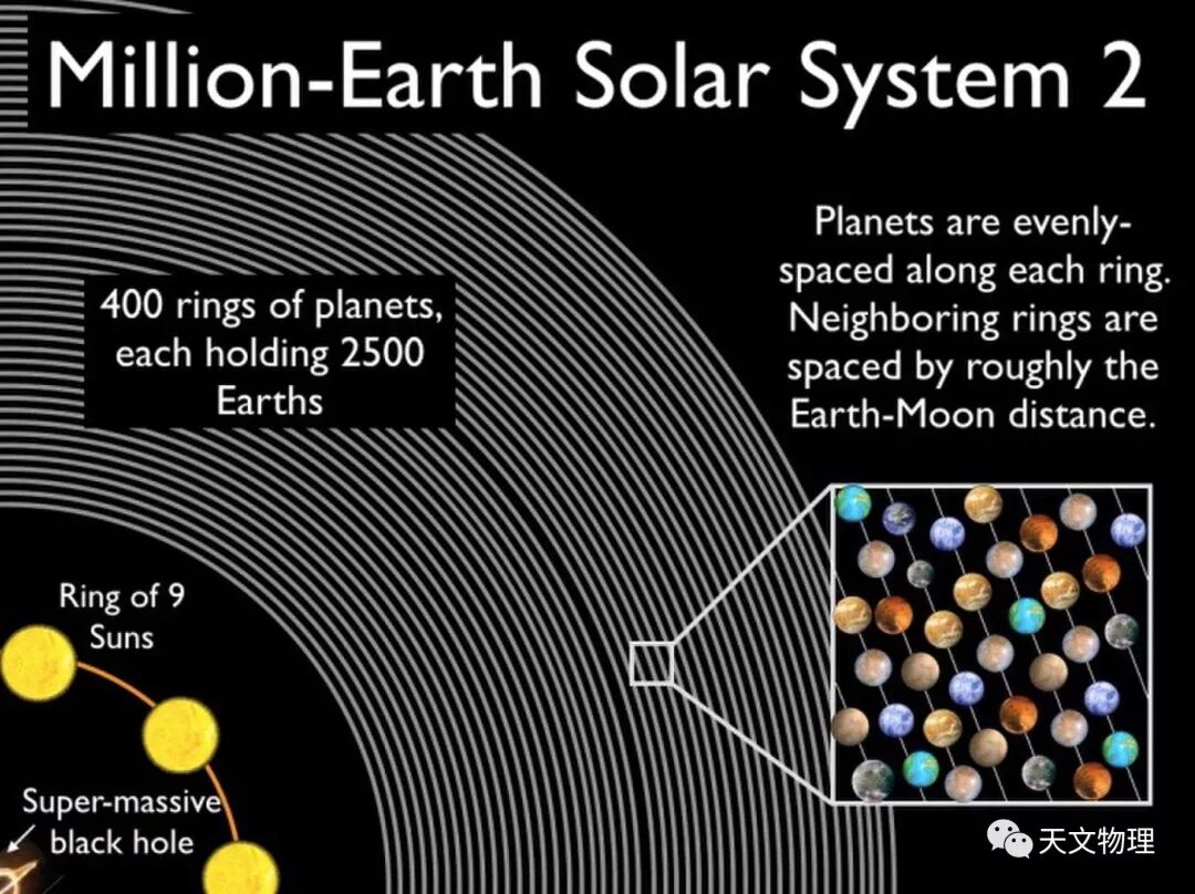 这个装置和拉里·尼文书中的‘环形世界’的区别在于,在这种情况下,行星之间没有可居住的表面积。这样的百万行星系统从何而来?雷蒙德说:“我可以想象,超级先进的外星人创造了一个系统,就像百万地球的太阳系一样,是一种宇宙艺术,有点像摩天大楼或彩绘冰山的艺术,在最宏伟的尺度上看看我们有多奇特。或者外星人可能会把这种系统建成动物园,他们可以有一个从最热到最冷的气候梯度,在整个宇宙中储存各种各样的生物。当然必须小心,不要把太空生物的错误组合放在同一个行星环上,因为那样不会有好结果。总的来说,想出所有可能存在的行星系统是很有帮助的,有些发现可以通过‘去那儿’和想象一些远远超出常规的可能性来预测,这些系统是科幻小说和“去那里”的结合,想做的主要事情就是努力突破我们认为可能的极限。