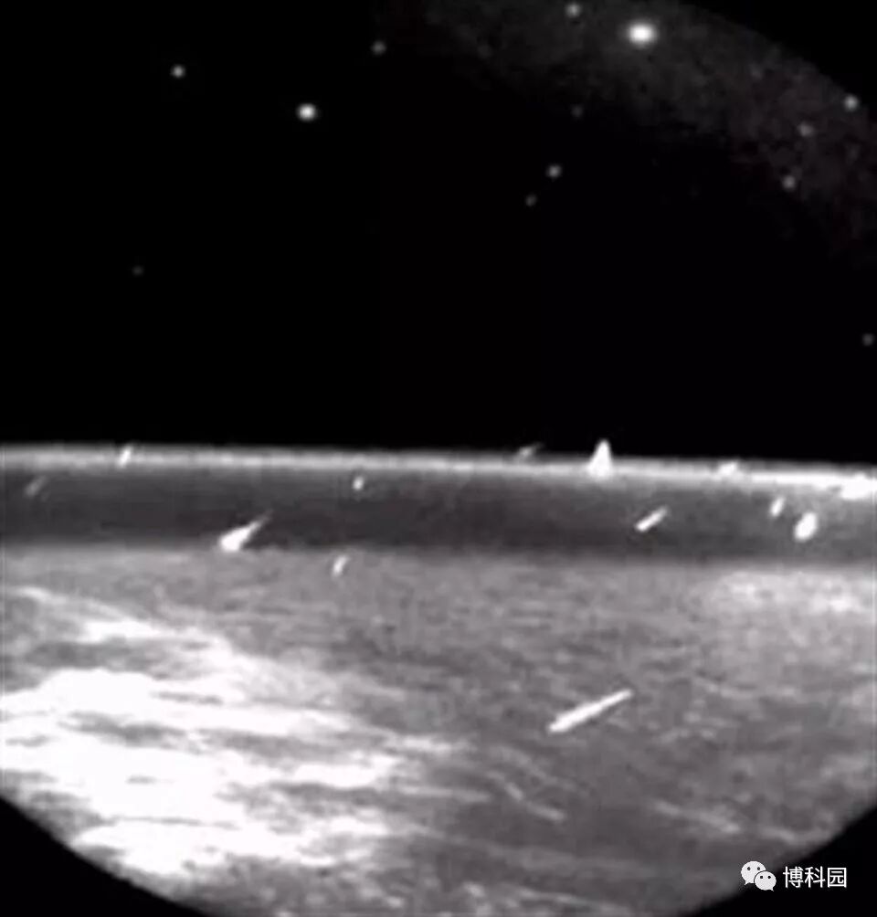 (从太空看)1997年狮子座流星雨。当流星撞击地球大气层的顶端时会燃烧,形成与流星雨联系在一起的明亮条纹和闪光。偶尔陨石会大到足以到达地表,变成一块陨石。图片:NASA / public domain