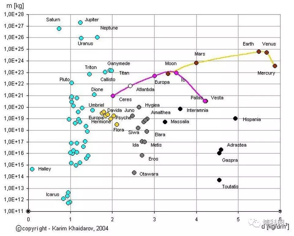 太阳系中各种天体的密度,注意密度和离太阳的距离之间的关系。图片:Karim Khaidarov