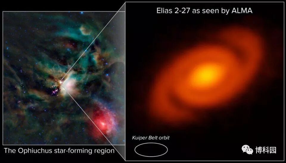 间隙、团块、螺旋形状和其他不对称现象表明,在Elias 2-27周围的原行星盘中有行星形成的迹象。然而系统各个组成部分最终形成的时间有多长,并不是众所周知的事情。图片:L.Pérez/B.Saxton/MPIfR/NRAO/AUI/NSF/ALMA/ESO/NAOJ/NASA/JPL Caltech/WISE小组