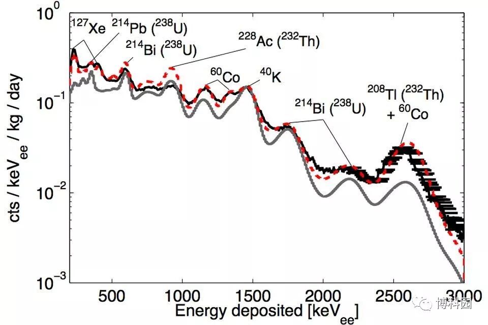 对LUX探测器背景的影响,包括放射性物质丰度随时间的衰减,LUX所见信号仅与背景相一致,随着时间的推移,元素逐渐衰变,反应物和产物的丰度也随之变化。图片:D.S. Akerib et al., Astropart.Phys. 62 (2015) 33, 1403.1299