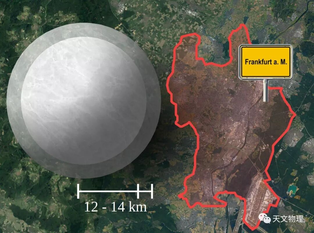 典型中子星的大小范围,图片:Lukas Weih, Goethe University, satellite image: GeoBasis-DE/BKG (2009) Google