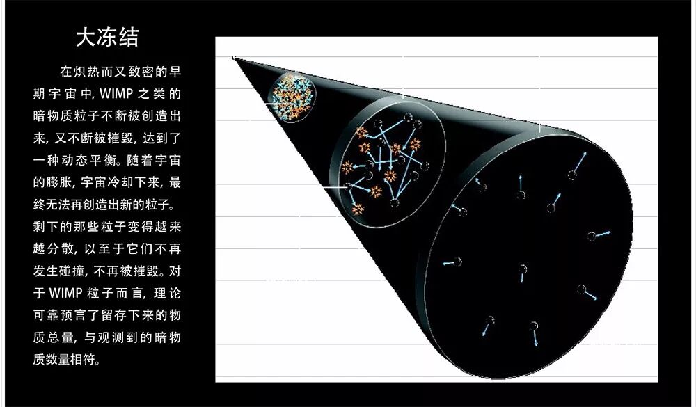 不过,这些粒子能否真正解释暗物质,还取决于它们的数量有多少。而这,正是粒子物理学观点真正吸引眼球之处。与其他任何种类的粒子一样,WIMP粒子也是在宇宙大爆炸的“烈焰”中产生的。在宇宙的极早期,高能粒子碰撞既能创造WIMP粒子,也能摧毁WIMP粒子,因而在任意时刻,都会有一定数量的WIMP粒子存在。这一数量会随时间而变,具体取决于受宇宙膨胀驱动的两个相互抵触的效应。第一个效应是宇宙这锅“原汤”的冷却,这会降低可用于产生WIMP粒子的能量,因此它们的数量会减少。第二个效应是粒子的稀释,这会降低粒子碰撞发生的频率,直到碰撞实际上不再发生为止。到了此时,也就是大爆炸后大约10纳秒(nanosecond,十亿分之一秒),WIMP粒子的数量便被冻结了下来。宇宙不再拥有创造WIMP粒子所需的高能量,也不再具备摧毁它们所需的高密度。