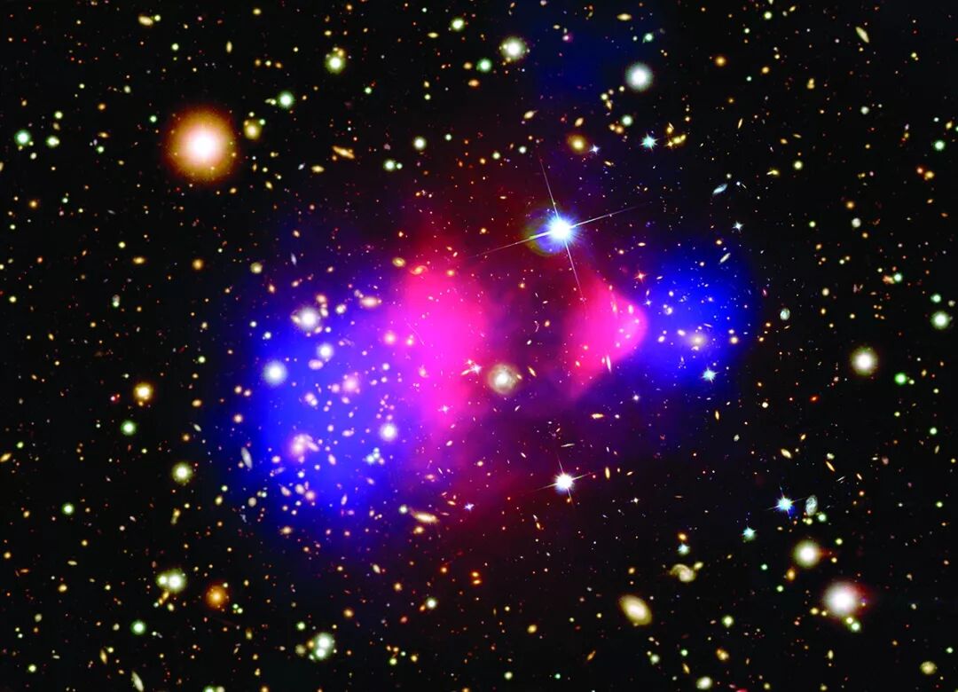 子弹星系团是天文学家手中最令人信服的暗物质证据之一。它实际上是一对相撞的星系团。碰撞并没有影响星系里的恒星(可见光图像),因为在星系团尺度下,恒星实在是太小了,但星际气体云狠狠地撞在了一起,释放出X射线(粉色)。暗物质(蓝色)的引力扭曲了背景天体发出的光,暴露了它自身的存在。暗物质与恒星依然交融在一起——表明不论是什么粒子构成了暗物质,它们都非常不喜欢发生相互作用。