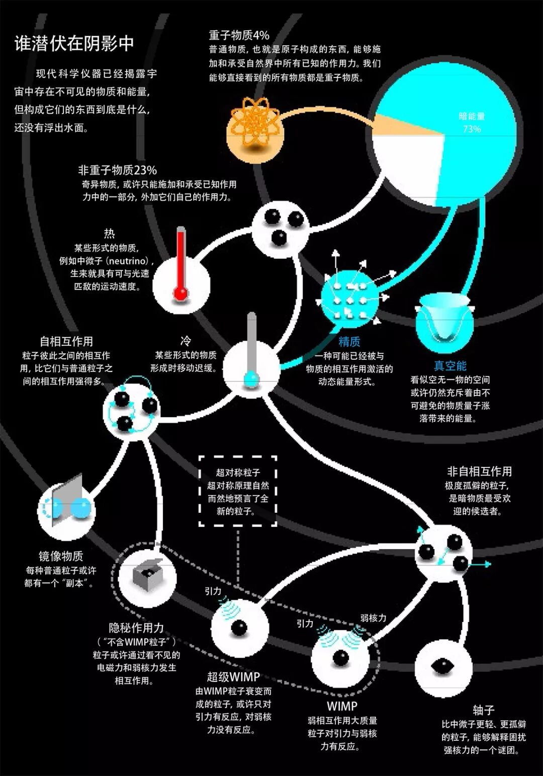 科学界正投入巨大精力专注于搜寻WIMP粒子,或许给人留下了这样的印象:这些粒子是理论上唯一可行的暗物质候选者。果真如此吗?事实上,粒子物理学领域最近取得的一些进展,已经揭露了其他的可能性。这些研究暗示,WIMP只是浮于水面之上的冰山一角。潜藏在水面之下的,可能是一些隐秘的世界,它们都有着自己的物质粒子和作用力。