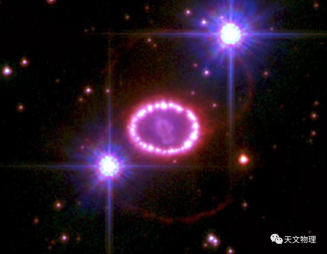 这张哈勃太空望远镜拍摄的超新星1987A残骸的照片显示了一个明亮的内部环,它与超新星爆炸产生的物质相互作用时发光。这个环的直径约为一光年。目前还不清楚是什么导致了这两个更大、更暗的环。这两个明亮的物体是大麦哲伦云中的恒星。图片:NASA, ESA, R. Kirshner and P. Challis (Harvard-Smithsonian Center for Astrophysics)