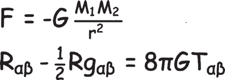 图2. 上面是牛顿的万有引力定律,下面是爱因斯坦的引力方程。不要纠结细节;只需注意,尽管在这两个方程式中都出现了G,但你并不能只用这些方程就算出G的值