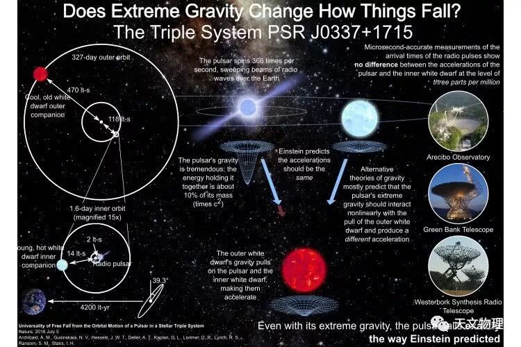 威斯康星大学密尔沃基分校的物理学副教授、论文的合著者大卫·卡普兰(David Kaplan)说:当脉冲星运动时,就会有某种东西引起它。如果爱因斯坦是对的,那一定是白矮星的引力使脉冲星运动。这组天文学家使用荷兰的韦斯特伯克合成射电望远镜、西弗吉尼亚州的格林班克望远镜和波多黎各的阿雷西博天文台跟踪这颗中子星达六年之久。如果中子星与白矮星的落差不同,那么脉冲到达的时间就会不同于预期。但据研究人员所知,这并没有发生。