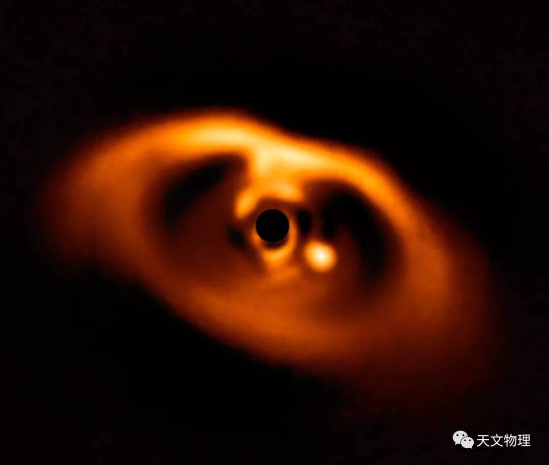 这张照片来自欧洲南方天文台超大望远镜上的球面仪,这是第一张清晰的行星形成过程照片,围绕着矮星PDS 70。这颗行星清晰可见,它是位于中心右侧的一个亮点,它被用来阻挡恒星眩目光线的日冕仪罩遮住了。图片:A. Müller et al./ESO