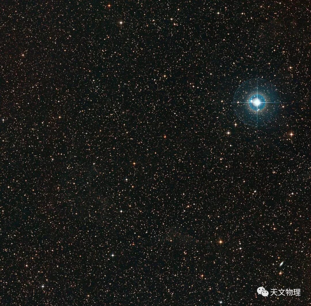 这张图片显示了暗淡的橙色矮星PDS 70周围的天空(在图片中间),明亮的蓝色恒星右边是χ半人马座。图片:ESO/Digitized Sky Survey 2. Acknowledgement: Davide De Martin
