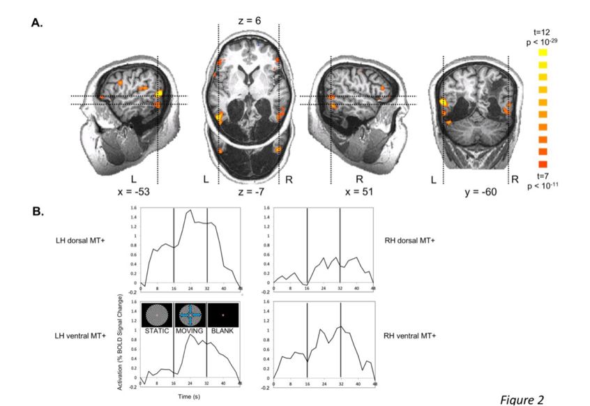 你瞅瞅,看到动态的棋盘,这家伙给“脑梗侠”阿姨的MT乐的,直“冒火光”(图中橙色区域为强烈激活的MT)~