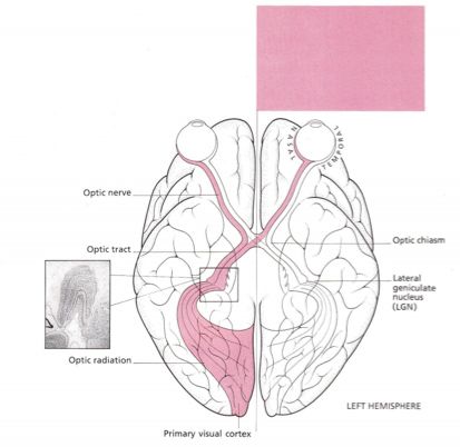 如上图所示,两个半拉眼睛接受到的信息,顺着两侧半拉视神经在十字路口会和,共同拐一个叫做“外侧膝状体”的大弯,一起投射到后脑勺管视觉的距状裂的视觉皮层上。不过不管它怎么传,脑梗侠阿姨的后脑勺阵亡了,按理说她应该啥都看不到了,之前她的经治医生也都是这样认为的。