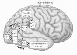 再往下传的时候,顺着上面绿色走的,是分析视觉信号所带来的“Where”也就是位置信息;而往下方蓝色走的,分析的是关于“What”信息,也就是去识别和描述看到的是什么东西?