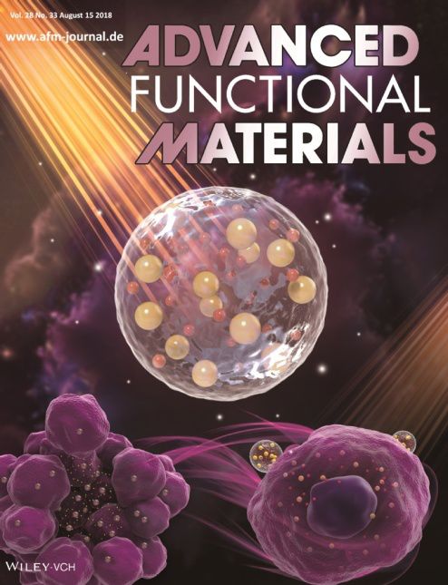 AFM杂志纸质版封面预览版。纳米聚合球在近红外激光激发下在肿瘤内部可以释放出阿霉素,并可将阿霉素输送到深层组织。