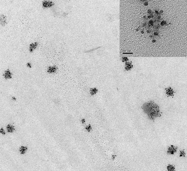 在超高放大倍数的透射电子显微镜下,可以观察到药物中含有大量的纳米聚合球。其中每一个聚合球(右上角放大图)中包含有超小尺寸的纳米点(黑色点)和阿霉素(球中灰色部分)。