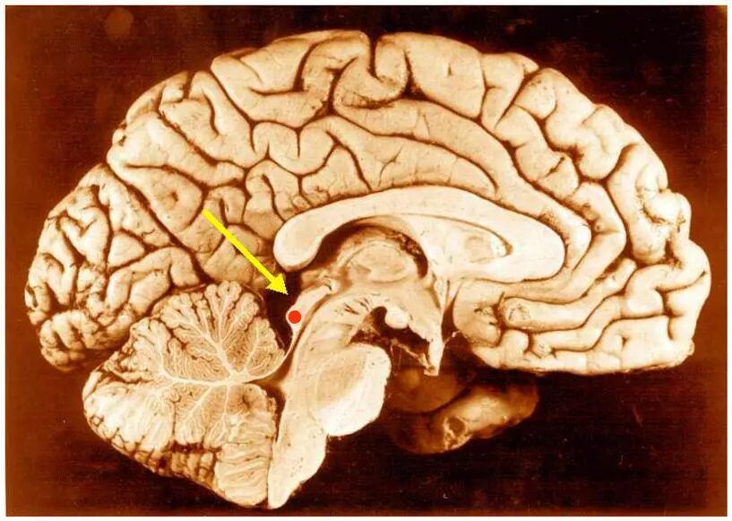 ○ 图中黄色箭头指出的部位是下丘(inferior colliculus),位于中脑下部背侧,是听觉通路的重要组成部分。位于中脑上部背侧的上丘(superior colliculus)是视觉通路的重要组成部分。