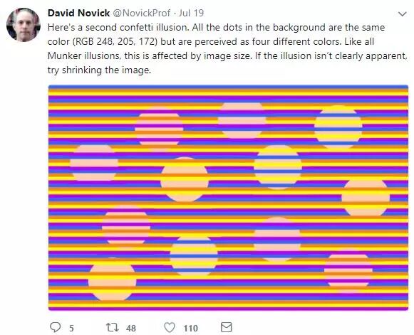 近日,美国得克萨斯州大学艾尔帕索市分校教授大卫·诺维克推出“光学幻觉测试”,引发热议。他在网上发布的图片显示,彩色横条上有几个圆圈,看起来好像是五颜六色的,但实际上这些圆点都是一种颜色:RGB 248, 205, 172。