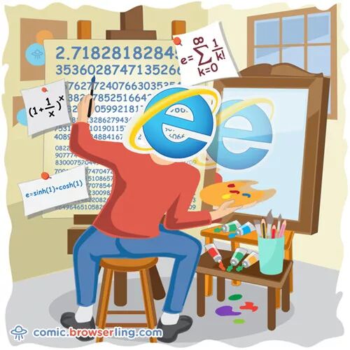这幅漫画作品的题目是“自画像”。谁的自画像?它就是众所周知的欧拉数“e”。我们看到“e”先生将自己在镜子里的像画到了画板上。正像我们在连接里看到的,画板上是“e”的值: