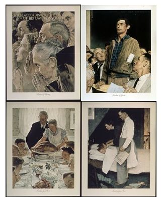 第二次世界大战时,洛克威尔在七个月内完成了“四大自由”的系列画作,此系列画作是根据美国总统罗斯福(Franklin D. Roosevelt)于1941年1月5日发表的全球人权演说而画的:“我们盼望有一个建立在四项人类基本自由之上的世界。第一是言论和发表意见的自由──在世界每一个地方。第二是每个人以自己的方式崇拜上帝的自由──在世界每一个地方。第三是不虞匮乏的自由……──在世界每一个地方。第四是免受恐惧的自由……──在世界每一个地方。”他把每一个抽象的概念形像化,用美国人平时的日常生活表现出来。但其中经历了一番曲折的经历。