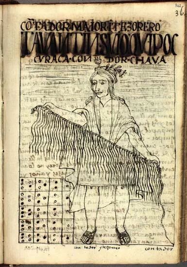 ○  奇普制造者,图片出自印加历史学家Felipe Guaman Poma de Ayala(ca. 1535-1616)的著作《第一个新纪事与良好政府》(El primer nueva corónica y buen gobierno)。左下角的格子代表一种类似于算盘的计算工具yupana,印加人在其中放入玉米或其他植物种子、小石子等用于做数学运算。| 图片来源:Wikipedia