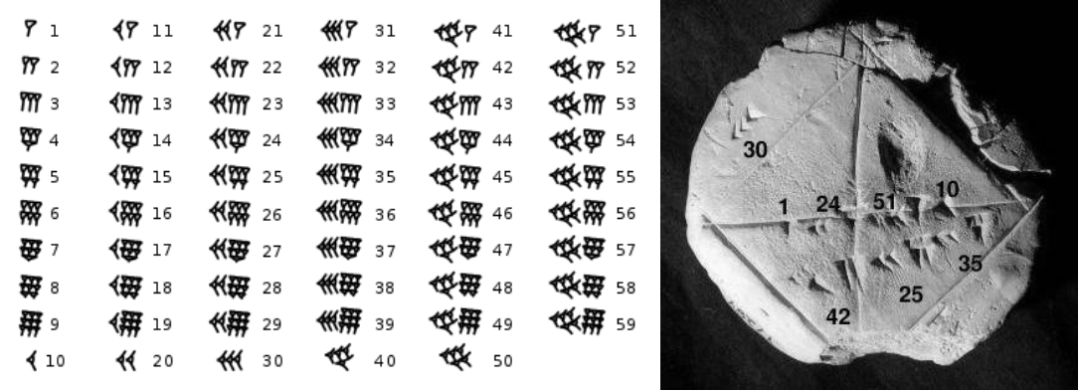 ○ 巴比伦楔形文字采用六十进制计数系统。右图为巴比伦泥板上,以六十进制表示的数字1 24 51 10是 √2的近似值,1 + 24/60 + 51/60^2 + 10/60^3 = 1.41421296... | 图片来源:Wikipedia